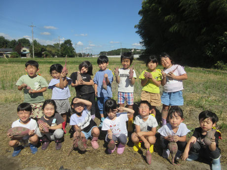 今日はひまわり組(5歳)あやめ組(4歳)のおともだちが、近隣の畑でさつまいも掘りを行いました。こどもたちが一番楽しみにしている農作物の収穫です。そして、さつまいも掘りが始まると先生の「スタート」の声とともに、こどもたちは一斉にさつまいも掘りを始めました。少し経つと「あった」「大きい」等の声があちらこちらから聞こえ始めました。こどもたちは、みんなで協力したり、先生に手伝ってもらったりと夢中でさつまいも掘りを楽しんでいました。